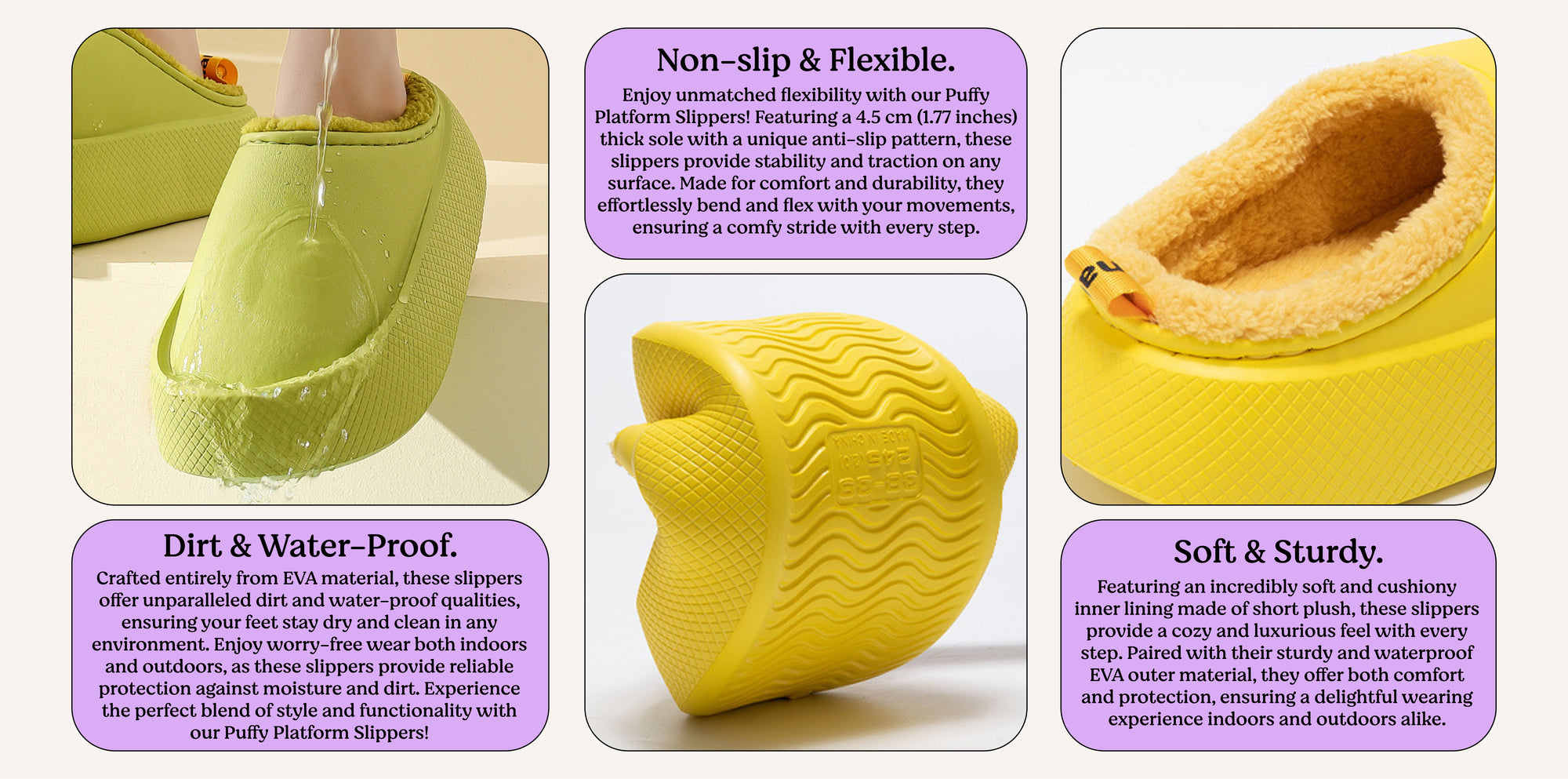 بالتأكيد! يوفر النعل السميك غير القابل للانزلاق في شبشب Puffy Platform قوة جر ممتازة، مما يجعله مناسبًا للاستخدام في الأماكن المغلقة والمفتوحة. استمتع بالراحة والأناقة أينما ذهبت!