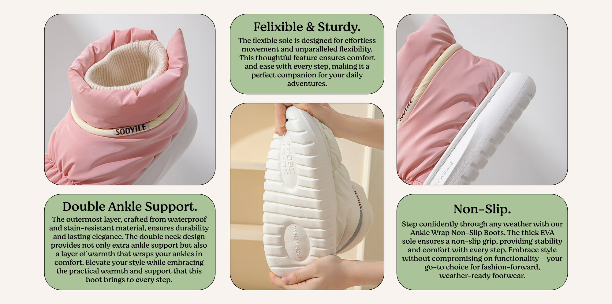 Umhüllen Sie Ihre Füße mit unseren rutschfesten Ankle Wrap-Stiefeln! Diese Stiefel haben ein wasser- und schmutzabweisendes Obermaterial, ein weiches Plüschfutter und eine 4 cm dicke rutschfeste EVA-Sohle für ultimativen Komfort und Halt. Die biegsame Struktur ermöglicht einfache Bewegungen und sie sind in vier modischen Farben erhältlich. Gehen Sie mit diesen Stiefeln selbstbewusst bei jedem Wetter!