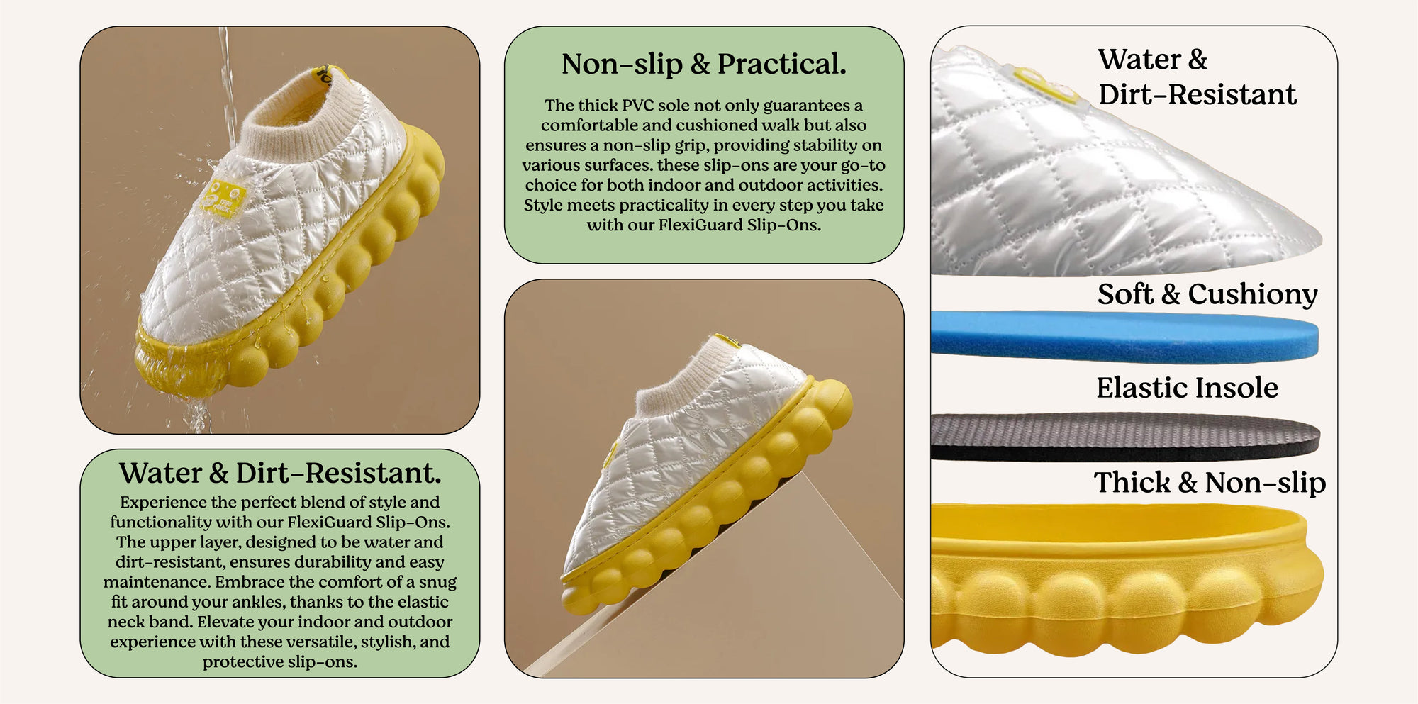 Wir präsentieren unsere FlexiGuard Slip-Ons – der Inbegriff von Stil, Komfort und Funktionalität. Mit einer 3 cm hohen EVA-Sohle, die sowohl rutschfest als auch verschleißfest ist, versprechen diese Slip-Ons einen sicheren und bequemen Gang. Das wasser- und schmutzabweisende Obermaterial sorgt dafür, dass sie unter verschiedenen Bedingungen frisch bleiben. Erleben Sie die perfekte Passform mit dem elastischen Knöchelhals, der nicht nur Halt, sondern auch Flexibilität für Bewegungsfreiheit bietet. Diese Slip-Ons sind in fünf leuchtenden Farben erhältlich und Ihre erste Wahl für eine Mischung aus Mode und Funktionalität!