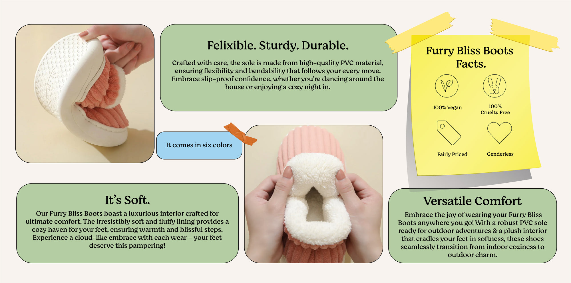 Der Furry Bliss Boots sind die ultimative Kombination aus Stil und Komfort! Diese Stiefel haben eine weiche und flauschige Innenseite, die Ihre Füße warm und gemütlich hält. Die flexible, rutschfeste Sohle sorgt für Sicherheit und Haltbarkeit, während die sechs Farboptionen jedem Outfit eine lustige Note verleihen! Genießen Sie Komfort und Stil mit unseren Furry Bliss Boots.